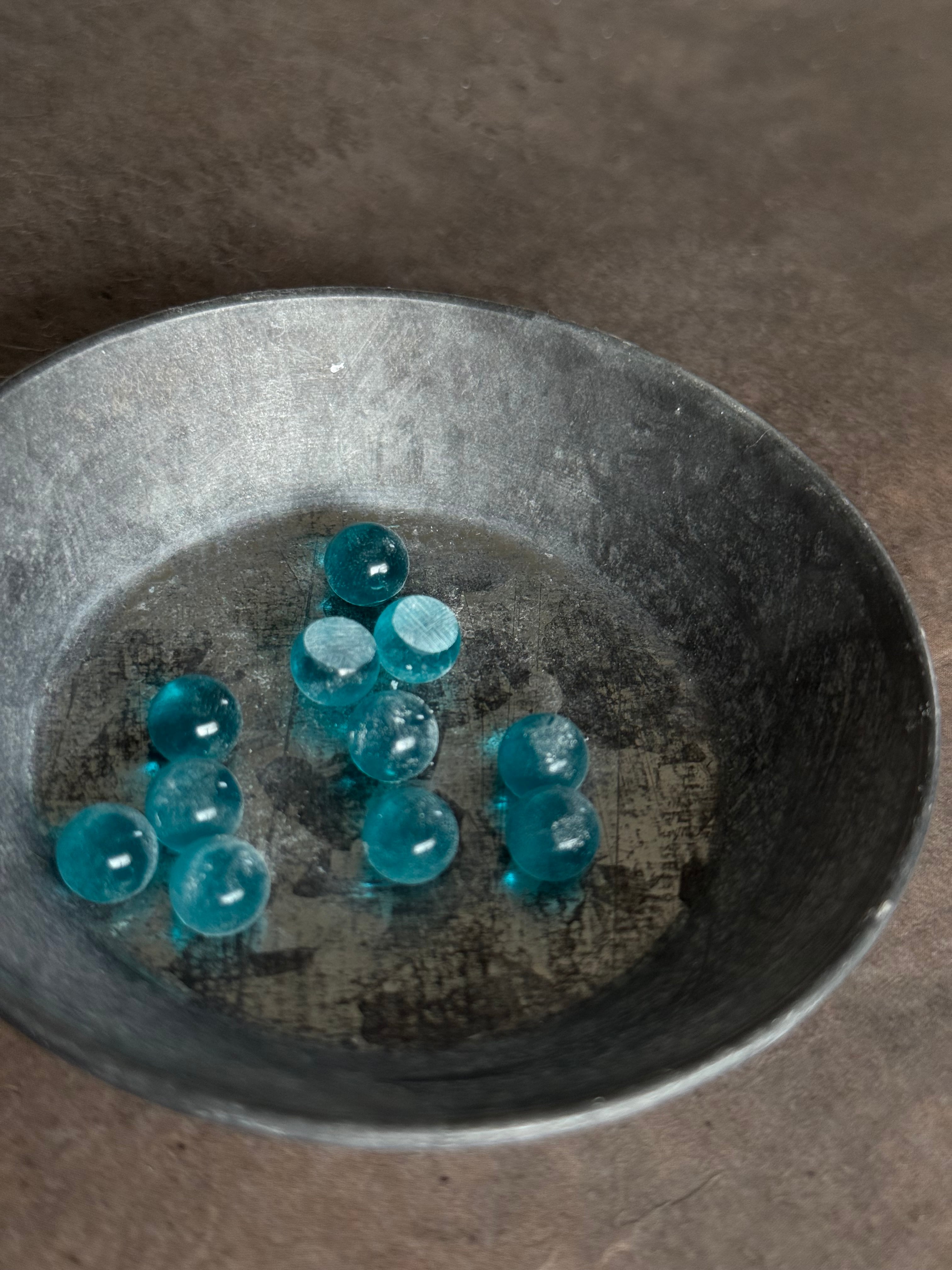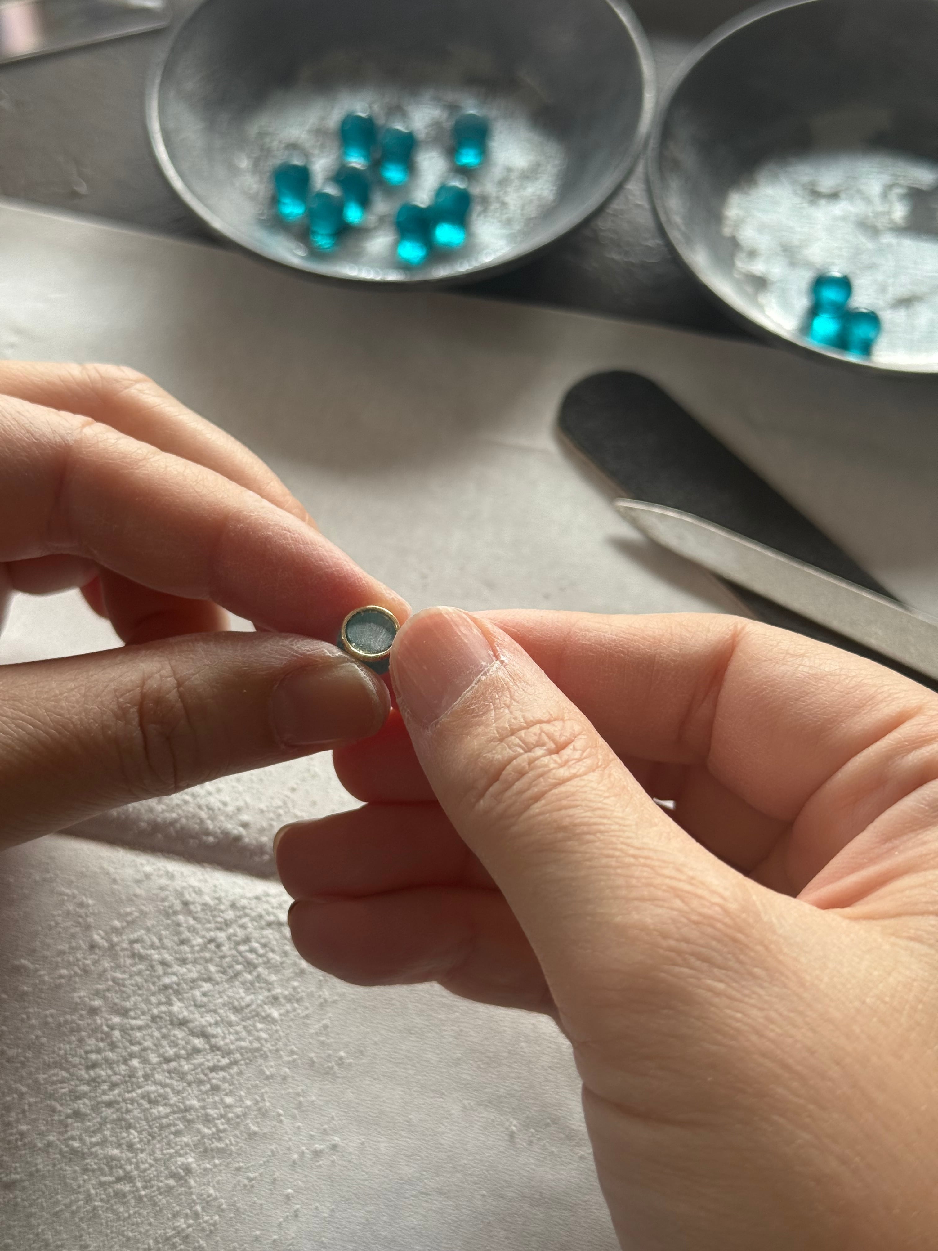 「見に纏う、碧の揺らぎ」 8mm|指元に、澄んだ光が舞う主役の粒。 _________________________ 色のつくりかた この作品は、着色液による染め色ではなく、 解かれた「繊維」を幾重にも重ねることで ひとつの色を生み出しています。 繊維の質感そのものを「色」として捉えることで、 描く着色では到達できない、深い奥行きが生まれます。 手元を動かすたびに移ろう、 複雑な表情の変化をお愉しみください。 _________________________ ひとつだけの表情 繊維の舞い方や重なりは、 素材との対話から生まれる一度きりのもの。 同じ表情のない「不揃いの美しさ」は、 循環する物語の、ある一瞬を切り取った姿です。 その瞬間の気配を、静かに閉じ込めています。 _________________________ 素材・仕様 素材:独自加工繊維/レジン 径(作品部):約8mm リング:真鍮(電気メッキ) サイズ:フリーサイズ(最小サイズ 約9号) ※アーム部分をゆっくり動かすことで、ご自身で 微調整いただけます。 _________________________ 造形と日常 繊維が漂う、静かなしるし。 日常に溶け込みながら、 ふとした瞬間に、確かな印象として残る。 8mmという一粒には、 眺めたくなる揺らぎの深さを宿しています。 その存在はさりげなく、 しかし確かな存在感を放ちます。 なにげない日常を、 静かに深く彩りますように。